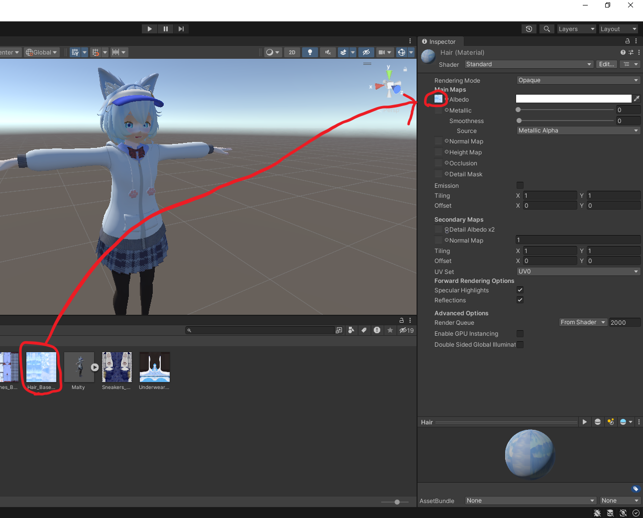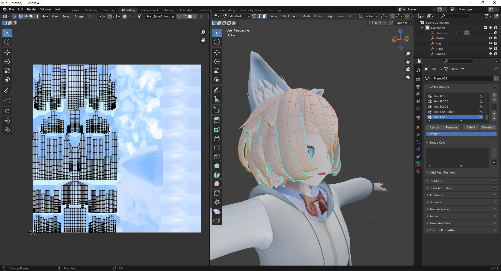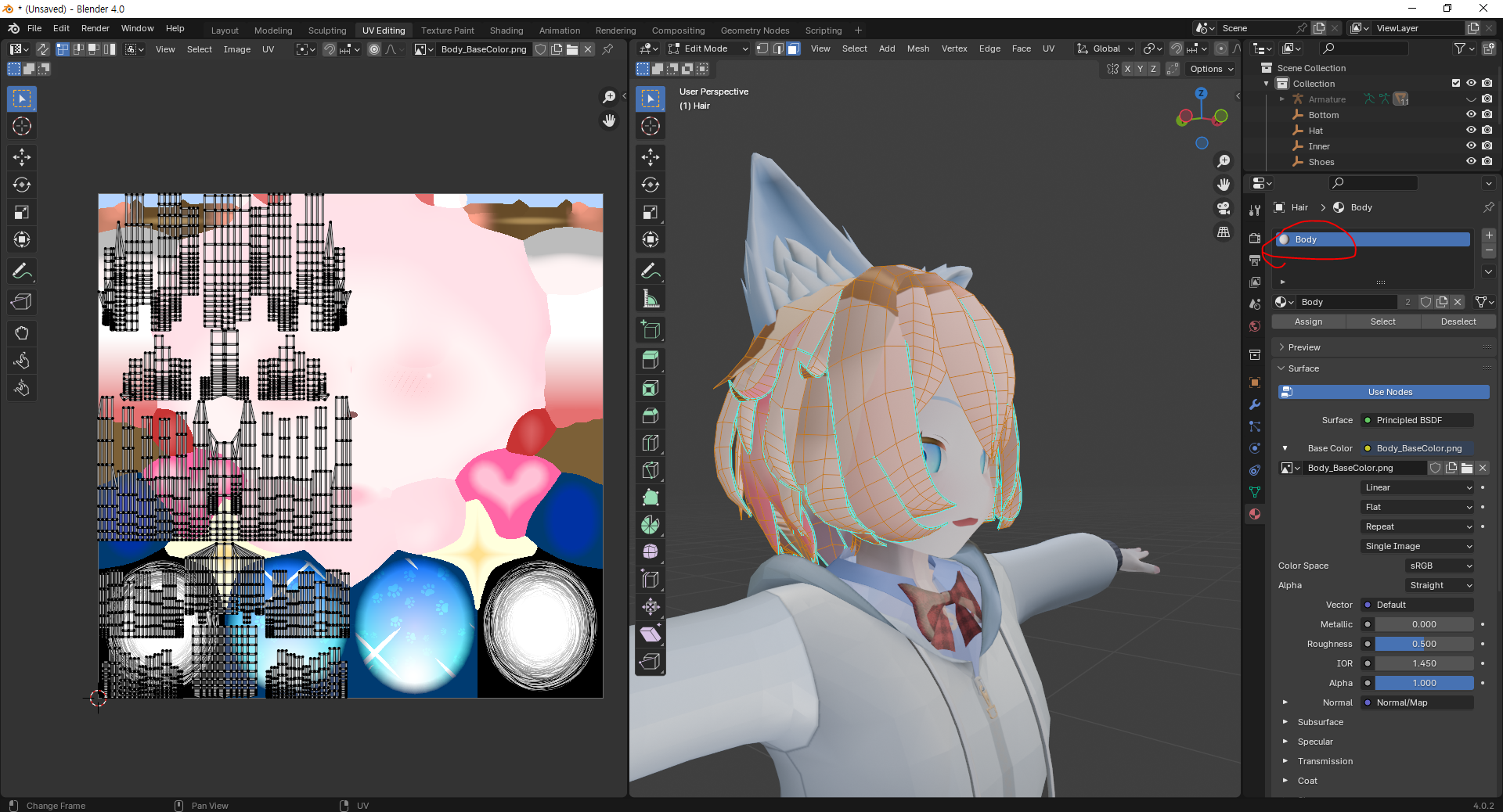 위의 두 사진을 비교하면 확실하게 알 수 있는데 메트리얼을 Hair에서 Body로 바뀌었지만 맵핑 정보가 전혀 바뀌지 않았음을 확인할 수 있다.
