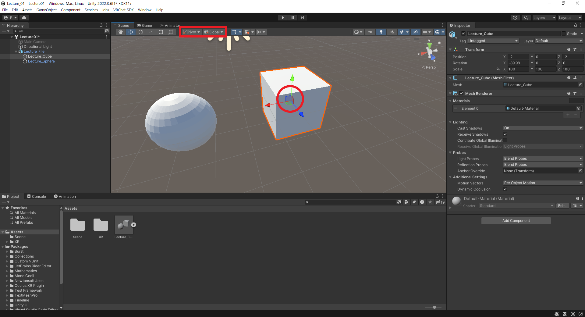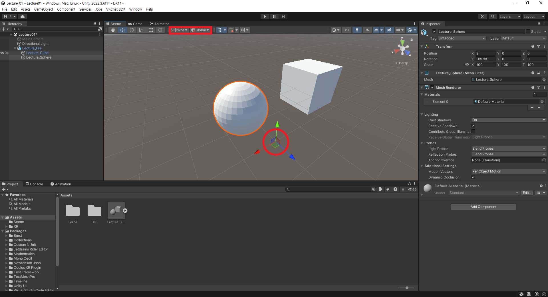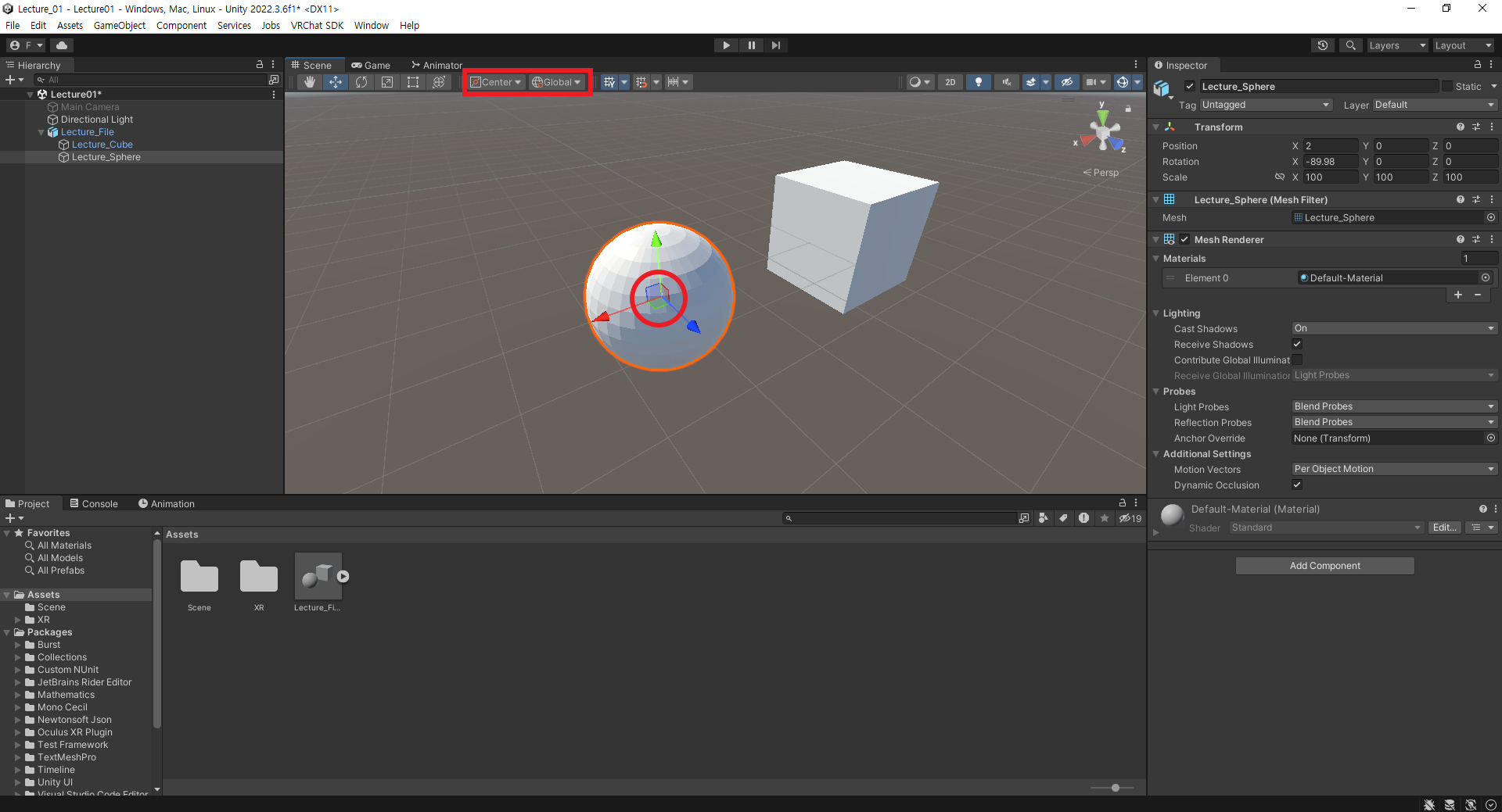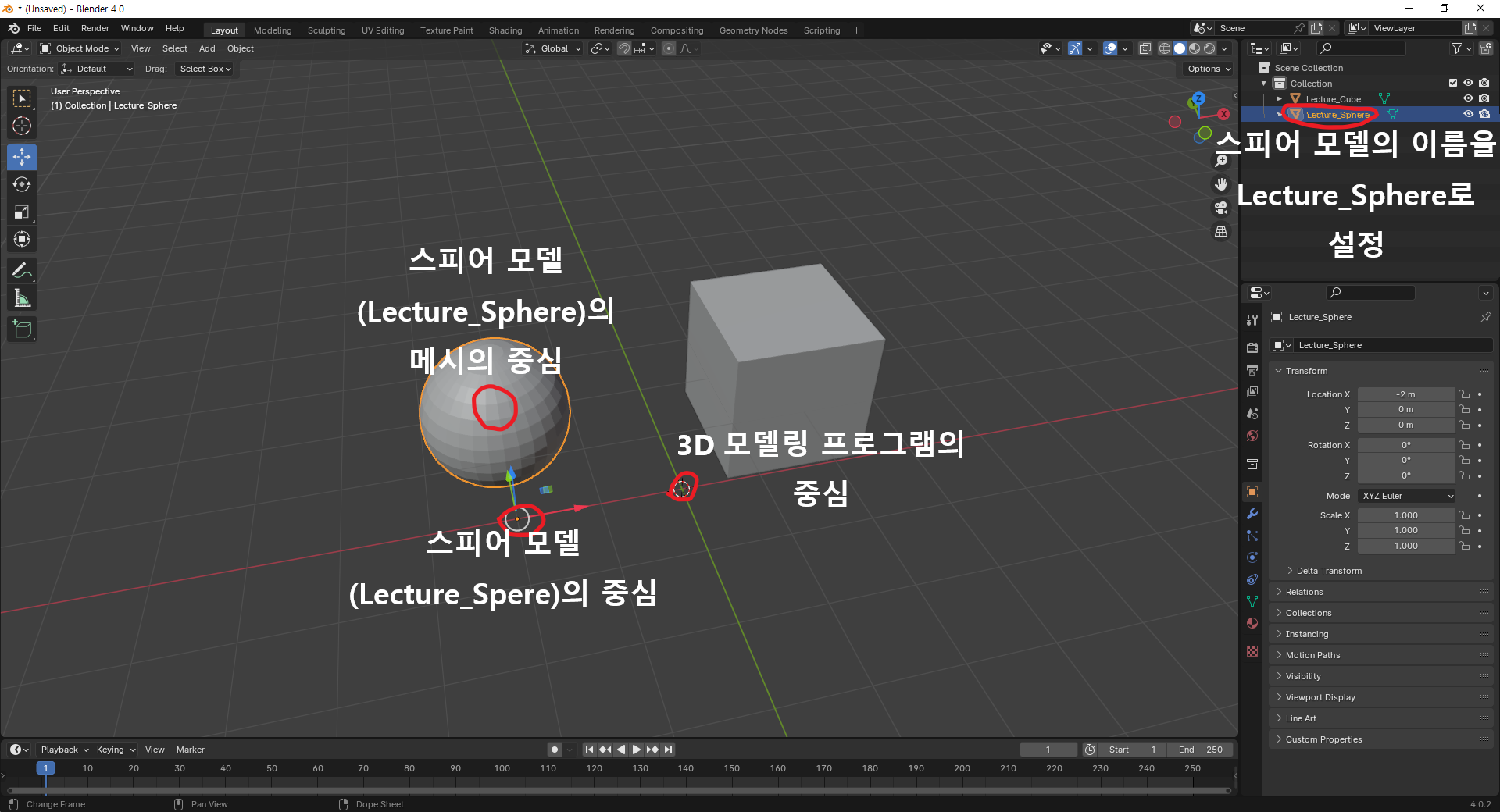 스피어(Lecture_Sphere)의 메시는 오브젝트의 중심은 X로만 -2, 메시 자체는 x로 -2, y로 2만큼 움직였다.