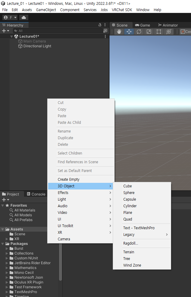 Hierarchy탭에 우클릭을 하면 여러가지 오브젝트를 만들 수 있다. 여러 오브젝트를 만들어 보고 이리저리 만져보자!