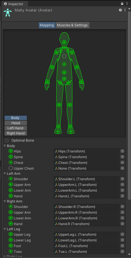 위의 요소들이 Humanoid 아바타들이 기본적으로 가지고 있는 신체 구성이다. 다만 본의 위치는 사람이 그렇듯 아바타에 따라서 다를 수 있고 Toe의 경우 안 넣는 경우도 가끔 있다.