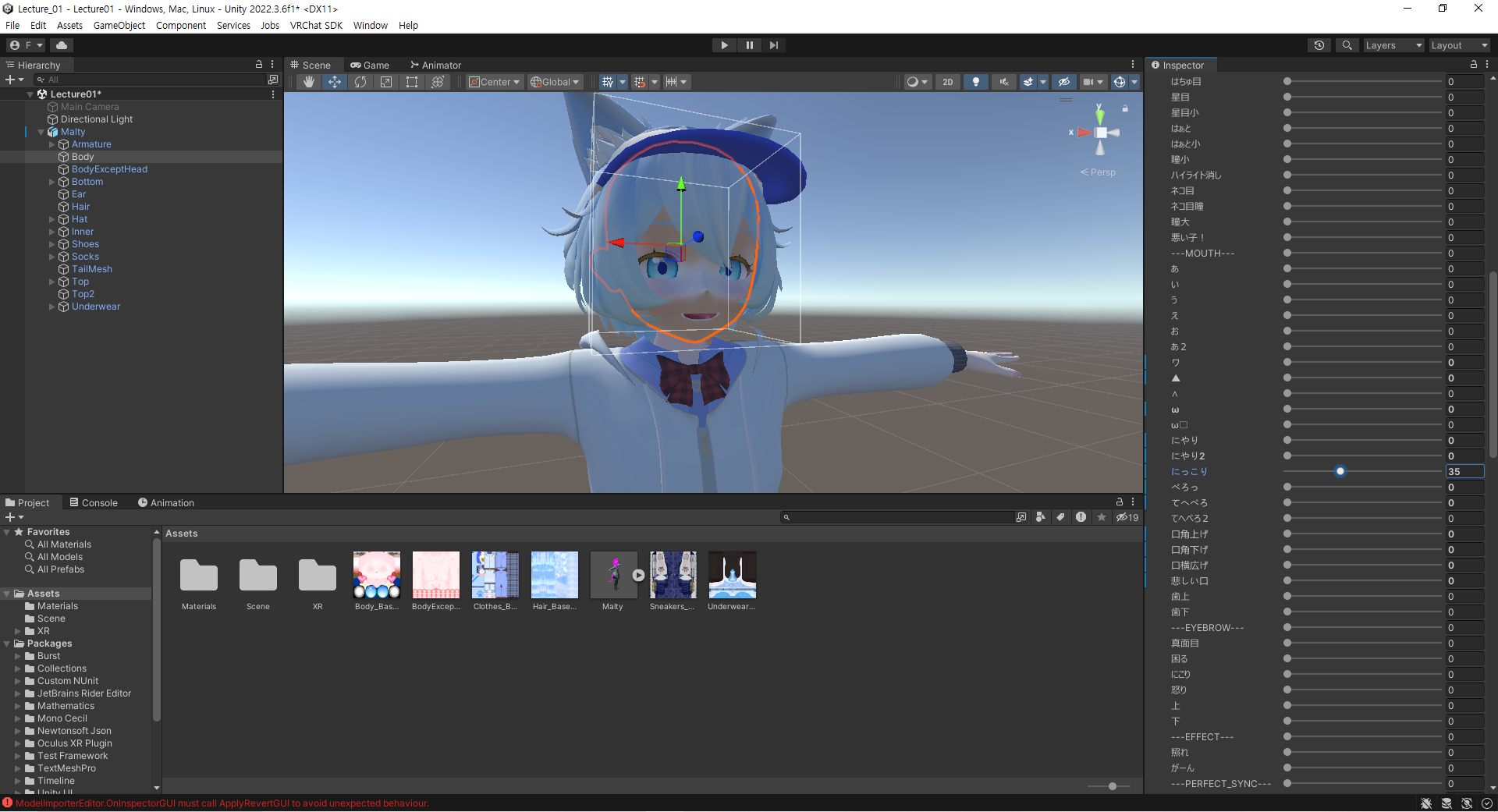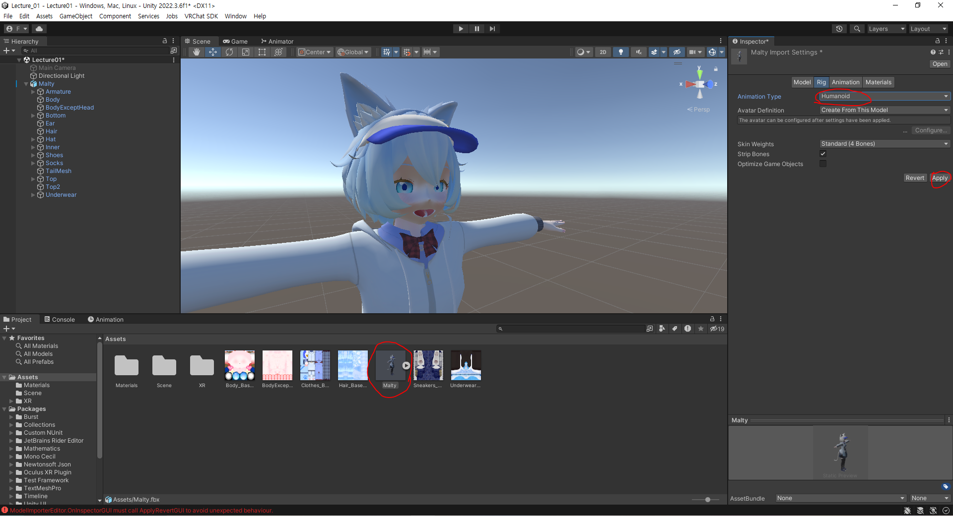 인간형 VRChat 아바타에게 있어 가장 중요한 것은 Humanoid에 대한 설정인데 Project탭에서 FBX 파일을 클릭해 Inspector탭에서 Rig탭에 가면 Animation Type 항목에서 Humanoid 설정을 할 수 있다. 이것은 사람형 모델을 위한 설정으로 VR기기와 아바타를 연결하는데 직접적인 영향을 준다. 또한 Humanoid 설정을 적용한 FBX 파일의 오브젝트는 자동으로 Animator 컴포넌트가 생성된다.