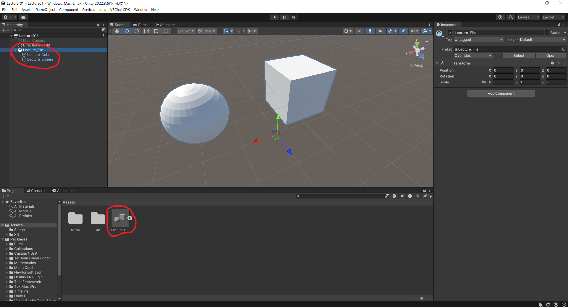 Project에 [Lecture_File]이라는 이름의 FBX파일을 불러왔고 이 에셋을 오브젝트로 만들자 부모 오브젝트의 이름이 [Lecture_File]로 되어 있고 자식 오브젝트에는 만들었던 2개의 메시, [Lecture_Cube]와 [Lecture_Sphere]이 있다.