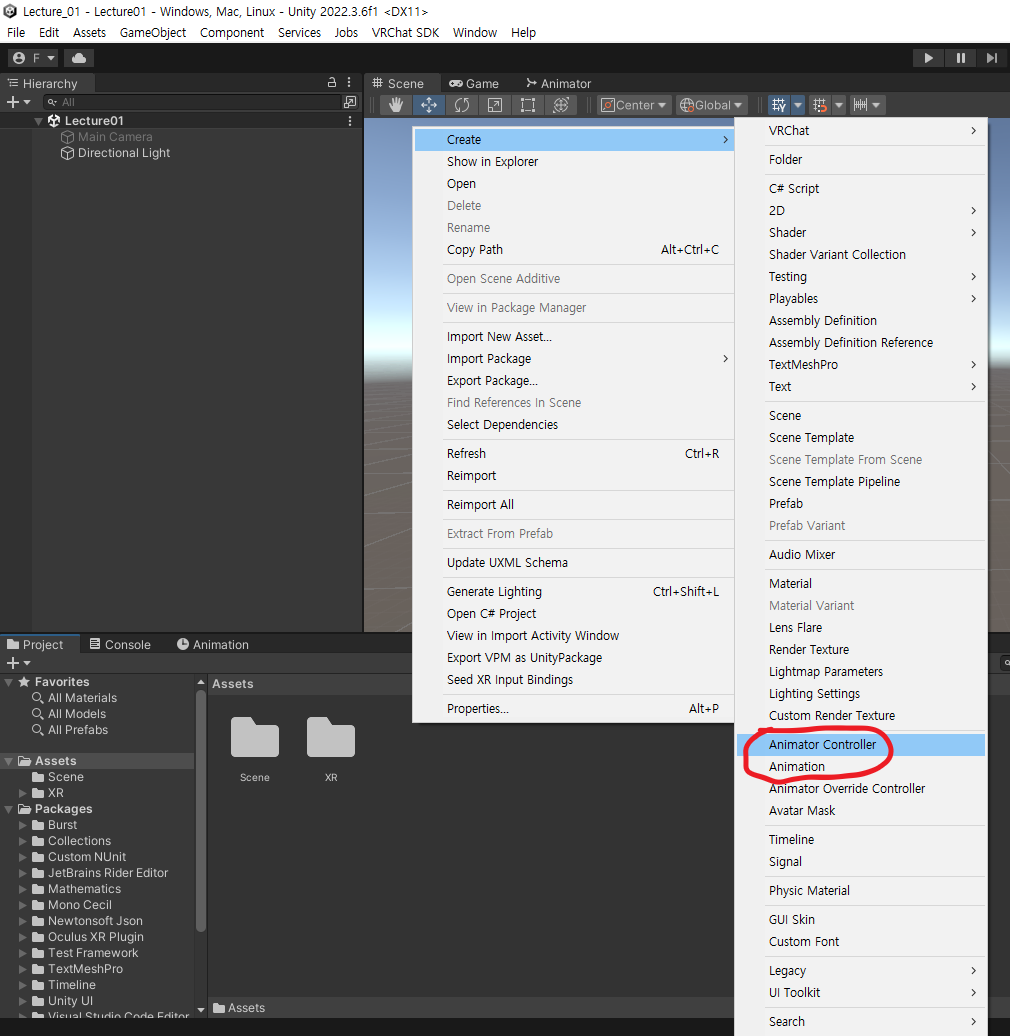 위에서 언급한 것들을 모두 만들어 주었다. 이름은 자신이 알아볼 수 있도록 정하는 것이 매우 중요하다. 지금이야 파일이 2, 3개에서 끝나지만 아바타 제작시에는 말 그대로 수많은 애니메이션, 오브젝트와 씨름해야할 것이기 때문이다.