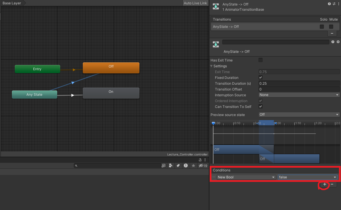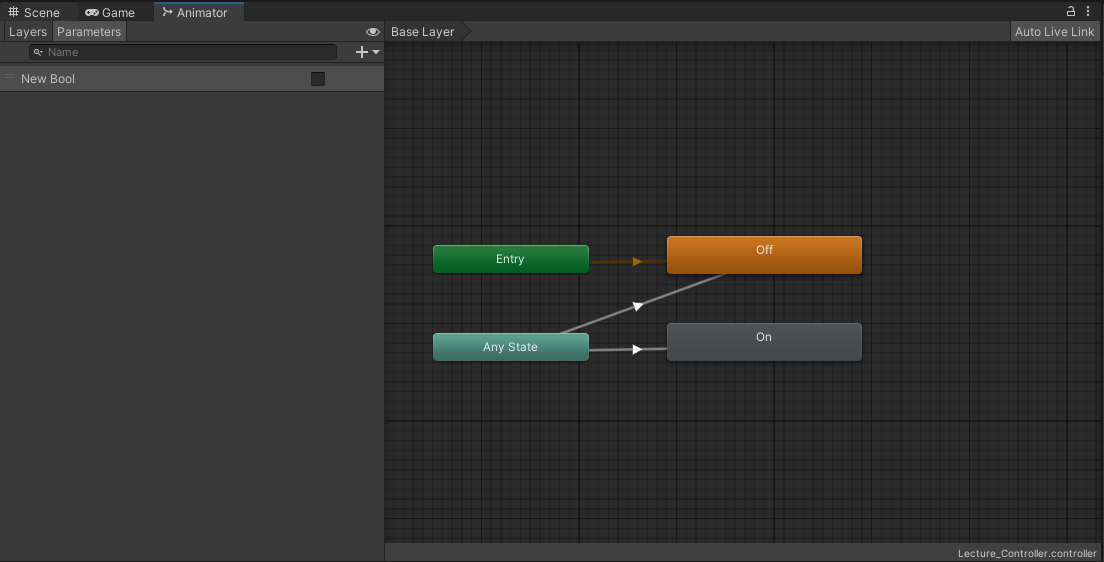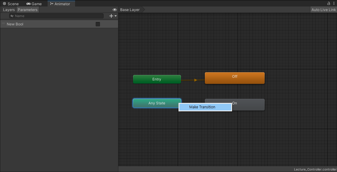 필자는 Off 애니메이션을 실행하기 위해서는 New Bool 변수가 False, On 애니메이션을 실행하기 위해서는 True 값일 때 발동되도록 설정했다.
