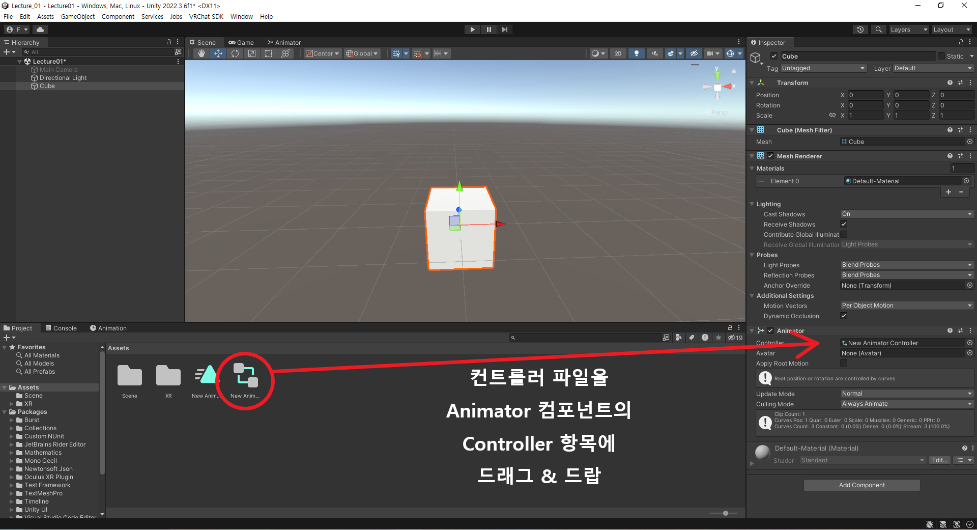 2. 애니메이션을 적용할 오브젝트를 생성하고 Inspector 창에서 Animator 컴포넌트를 만들어준다. 그 후, 컨트롤러 파일을 Controller 항목에 드래그 & 드랍하면 컨트롤러 파일을 적용한 것이다.