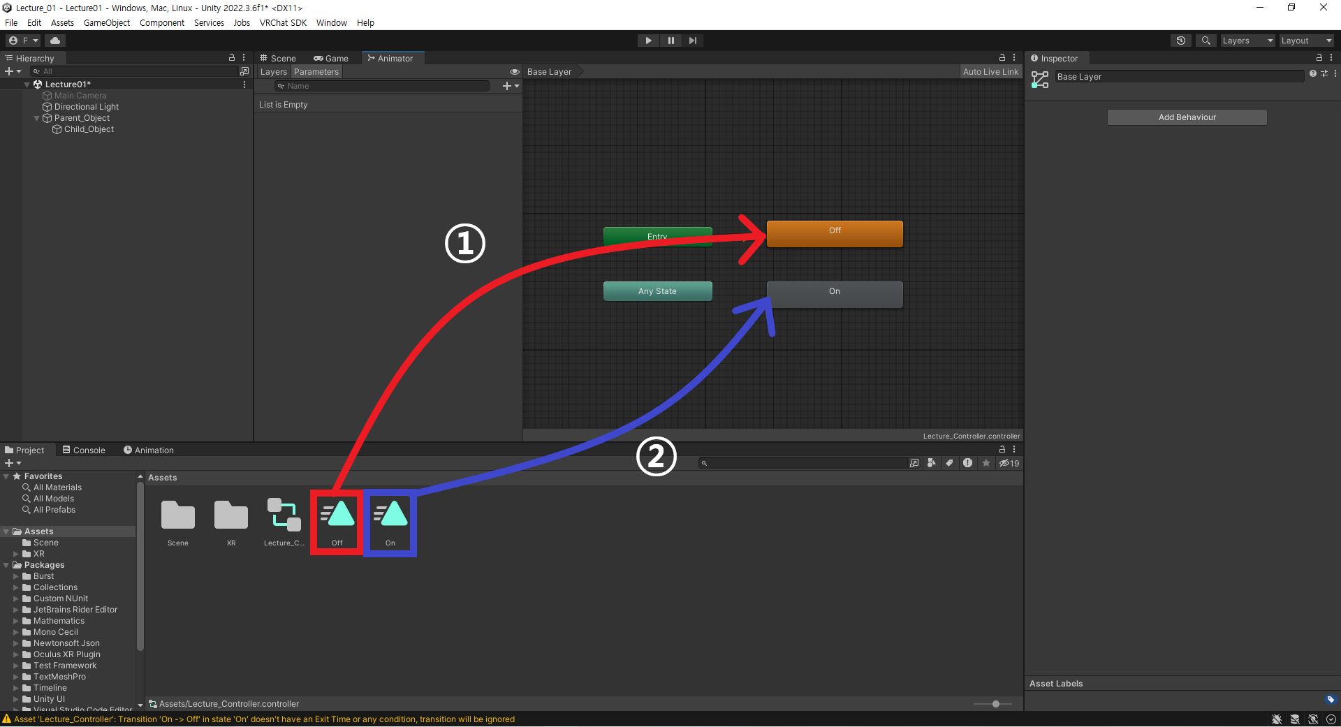 - 해당 컨트롤러 파일이 애니메이션으로 움직일 오브젝트의 Animator 컴포넌트에 적용되어 있어야 한다.
