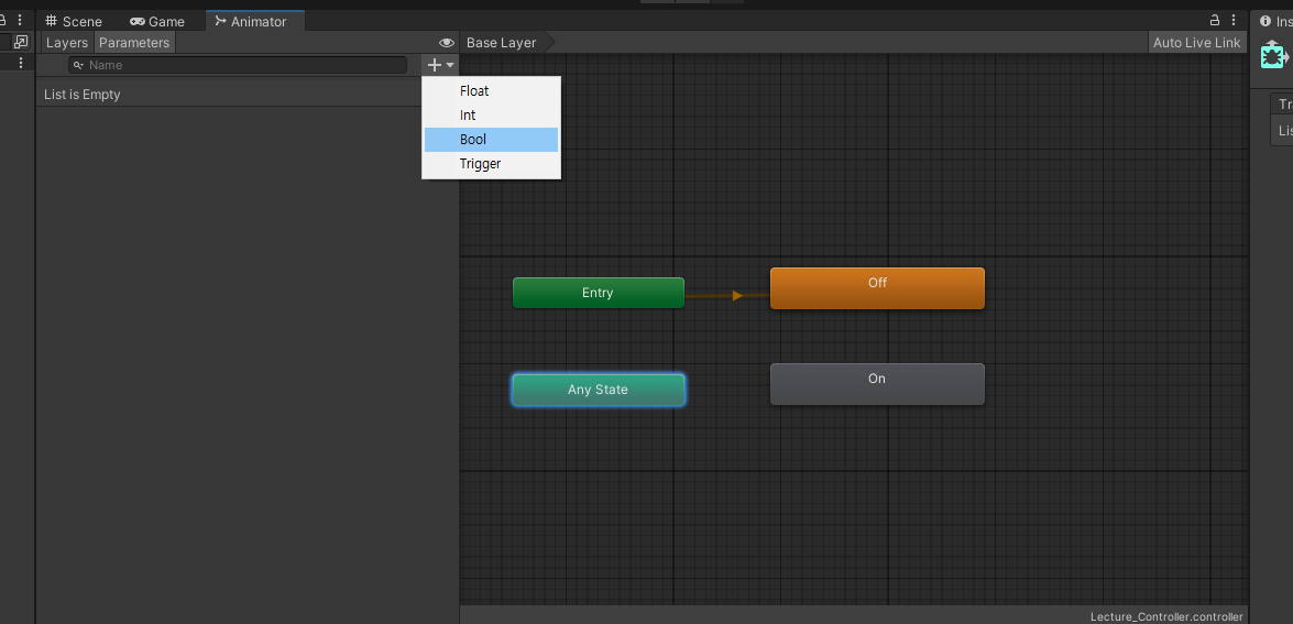 - Any State 노드 : 어떤 상황에서도 트랜지션에 해당하는 조건이 만족되었을 경우 해당 트랜지션과 연결된 애니메이션을 강제로 실행한다.